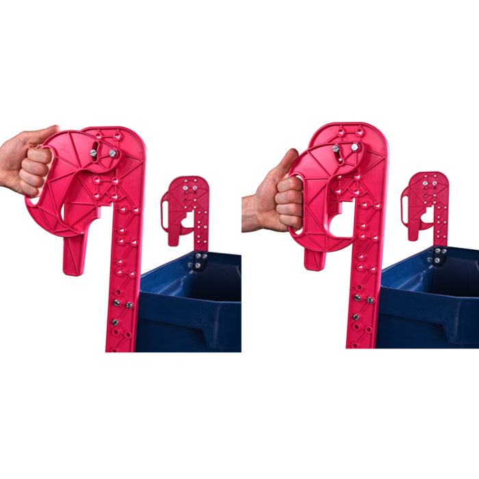 De Calf Buddy 5-speens is voorzien van zeer speciale haken die te hangen zijn aan allerlei types hekwerk; de haken zijn in hoogte verstelbaar. Meet de hoogte van uw rails en bevestig de haken aan de speenemmer met behulp van de voorgeboorde gaten zodat de speen altijd op 60 a 70 cm van de grond hangt. De emmers zijn gemakkelijk te dragen met handgrepen en vingergrepen.
